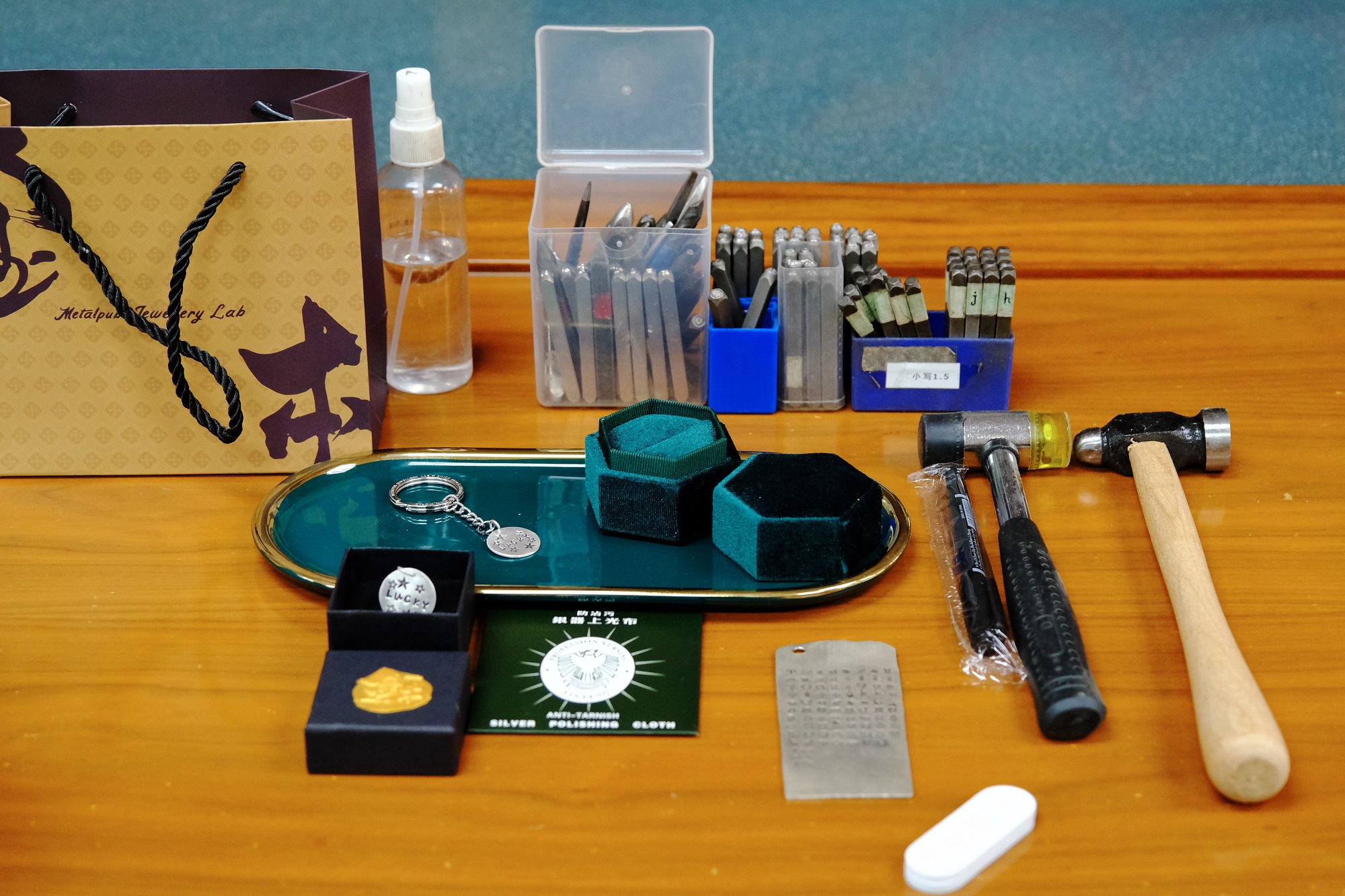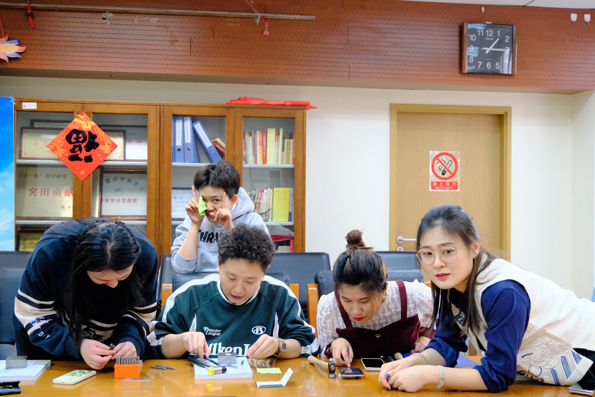 在专业老师的带领下,大家了解了常见银饰的种类、如何分辨真假银饰,学习了银饰的养护和搭配。 银饰在我国各民族服饰文化中,有着举足轻重的地位,它寓意真善美。在掌握了理论知识以后,大家迅速投入到制作过程中,先设计好图案,再用铁锤敲制刻字,制作肌理,然后放置在方铁上,用胶锤敲击银饰使其平整。最后交给老师打磨打孔、做旧抛光。