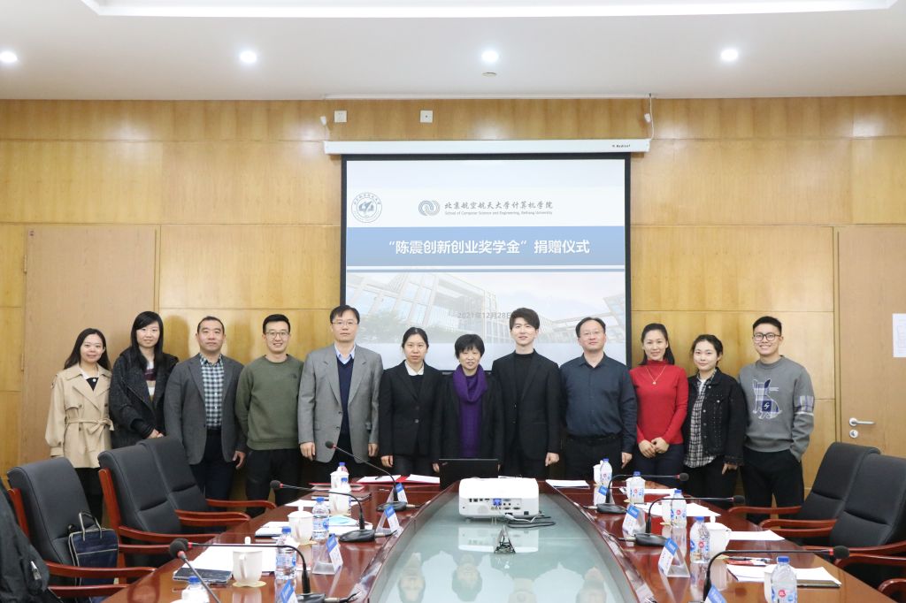 2021年12月28日,计算机学院“陈震创新创业奖学金”捐赠仪式在新主楼会议中心第四会议室举行。速感科技创始人陈震,北航教育基金会秘书长颜江芬,计算机学院党委书记、院长王蕴红,计算机学院副院长李建欣等人出席捐赠仪式。捐赠仪式由计算机学院党委副书记冯维成主持。